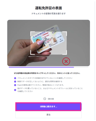 画面に表示されているヒントを読み、本人確認資料をカメラのピントに合わせて「3秒後に続きます」をクリックし、撮影を完了させましょう。