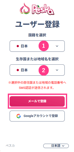 まずは、Peskaの公式サイトにアクセスし、「登録」ボタンをクリックしましょう。