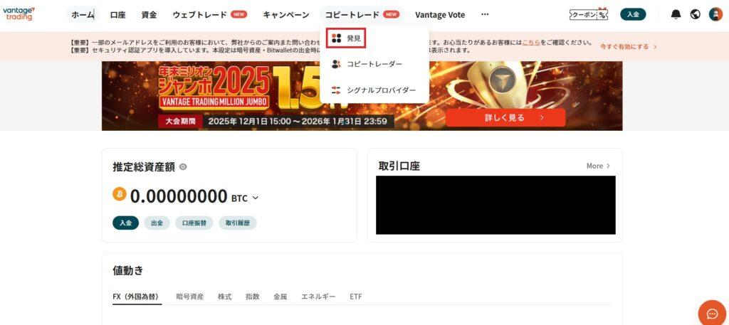 Vantageのコピートレードは、デモ口座では利用できません。
